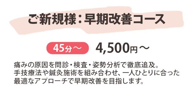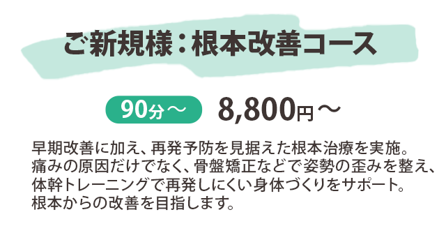 当院では、「痛みに即効性がある施術」「正しい骨格と筋肉の状態を記憶させる矯正」「痛みにくい体づくりのための筋力強化」を行い、症状を根本から改善に導きます。